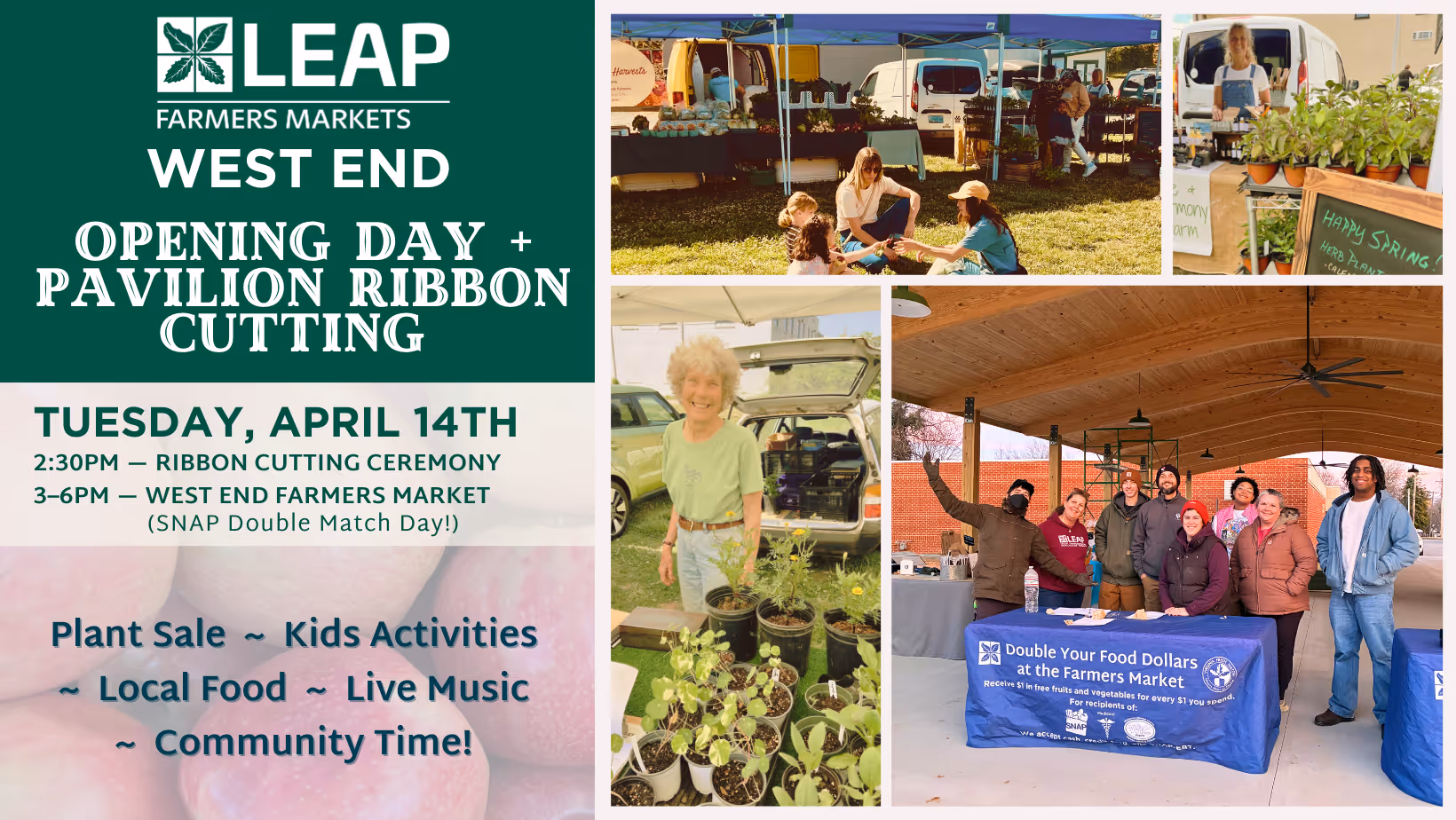 Join us on Tuesday, April 14th for Opening Day and Ribbon Cutting Ceremony for the West End Farmers Market Pavilion! After months of construction, we’re so excited to be officially moving the West End Farmers Market under the Pavilion and welcoming everyone to enjoy!
